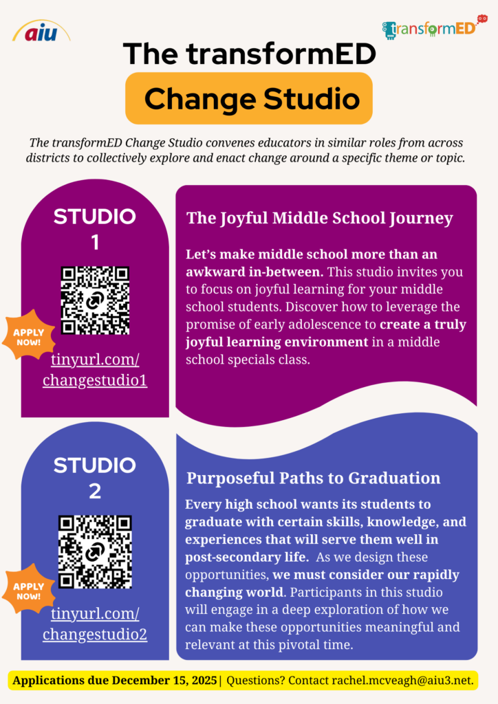 The transformED Change Studio convenes small groups of educators in similar roles from across districts to collectively explore and enact change around a specific theme or topic. This year, we are offering two studios.