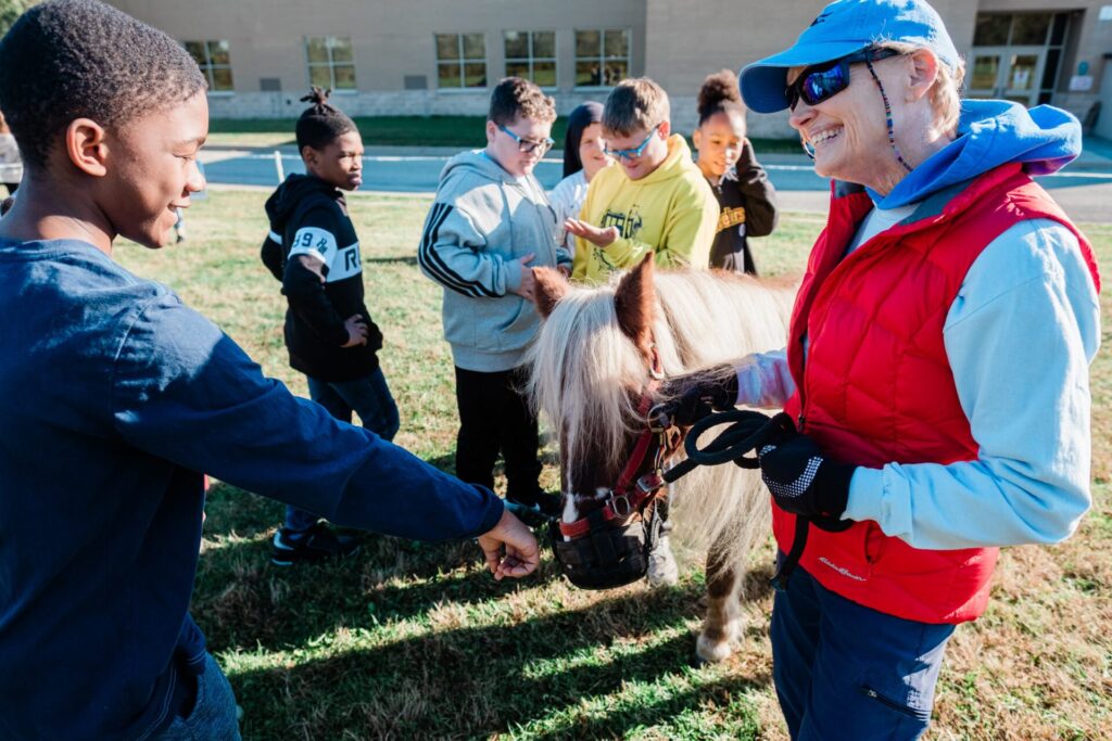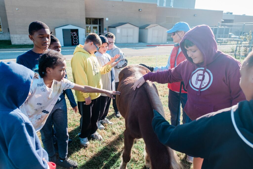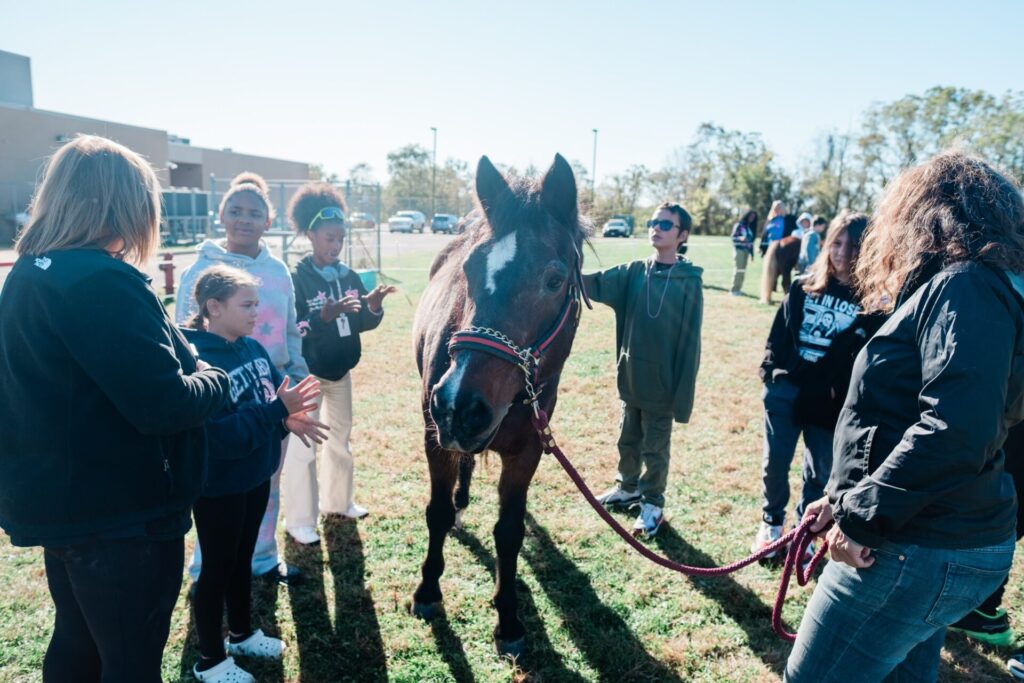 At East Allegheny, which was the first district to participate Thrive All Year, the Bella Terra team brings horses for a visit once a month, working with different grades on each visit. That’s Tier One of the program, with targeted lessons for each grade designed in partnership with the school’s counselors and teachers.