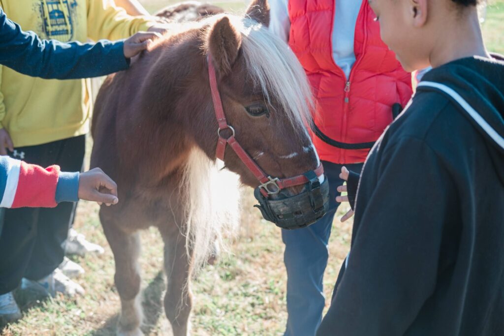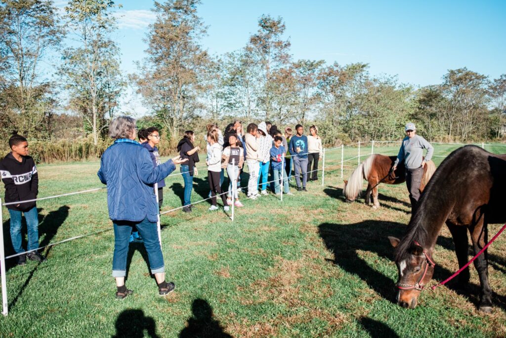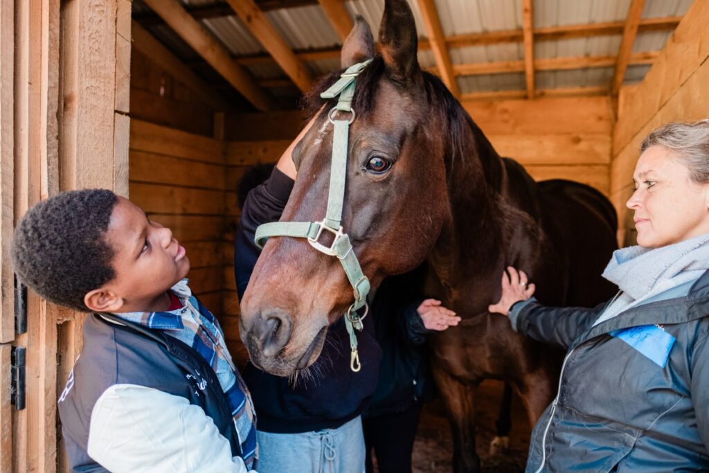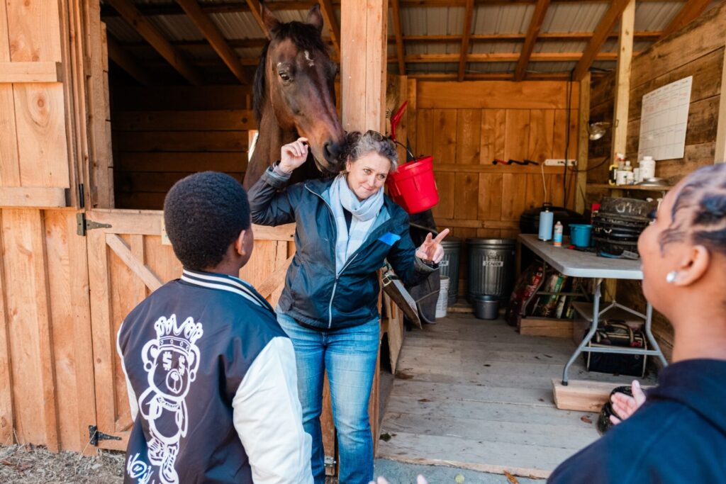 The group explores ideas like observation vs. perception (what you see vs. what you think) and practices calming their bodies while working with horses (emotional self-regulation).