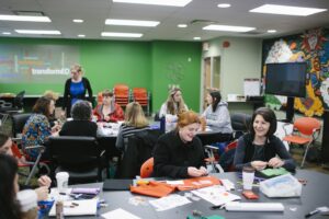 TransformEd is a space at the AIU that hosts various workshops for teachers. Here teachers are learning to sew circuity at the Bring and Bling Workshop, led by teacher Allison Francis & Megan Cicconi